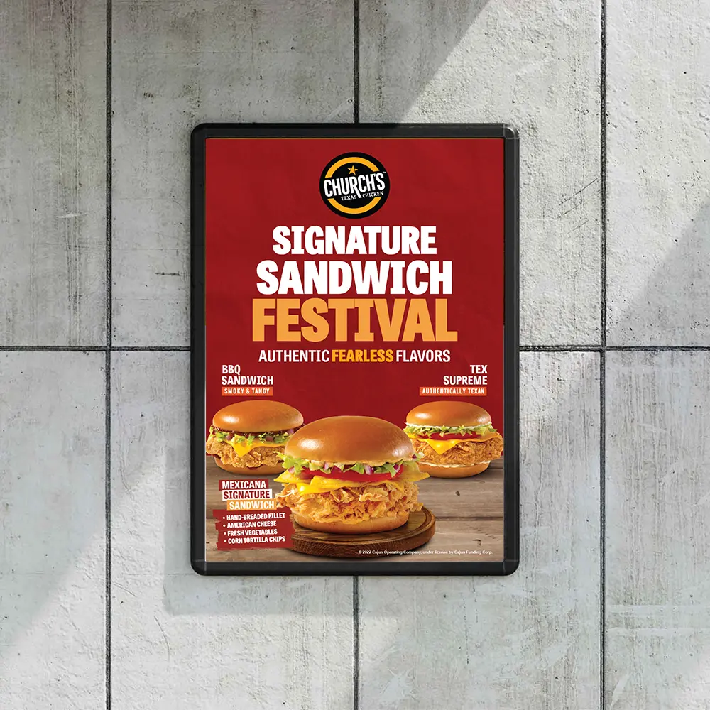 | Select Poster Designs | 2 Can Dine, 2 Can Dine W, Apple Pie, Bold Crunch, Chicken Fillet, Church Deals, Churro Bites, Drumstick, Fluffy, Orio Churros, Signature Sandwich, Sweet Love, Texas Crunchy, Texas Dry Rub, Wings For All |